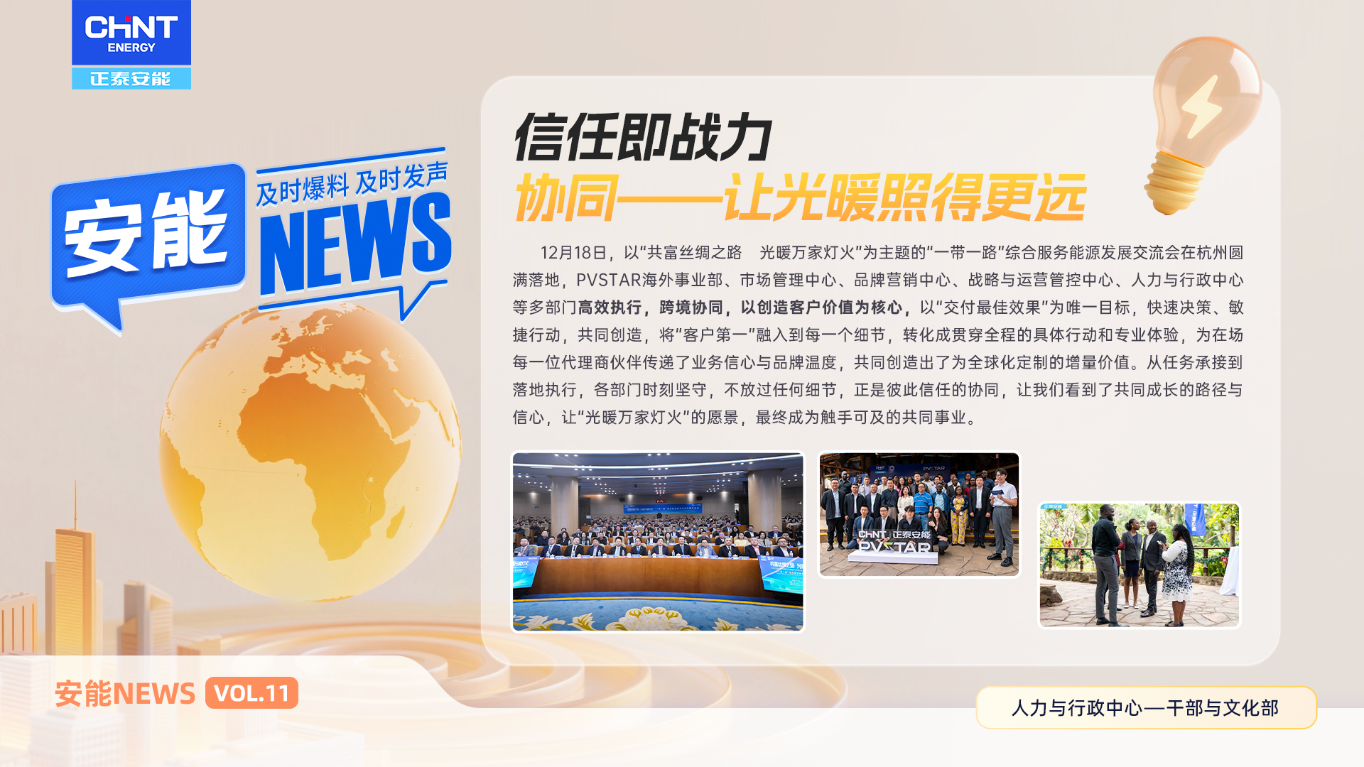 12月18日,以“共富丝绸之路 光暖万家灯火”为主题的“一带一路”综合服务能源发展交流会在杭州圆满落地。PVSTAR海外事业部、市场管理中心、品牌营销中心、战略与运营管控中心、人力与行政中心等多部门高效执行,跨境协同,以创造客户价值为核心,从任务承接到落地执行,各部门时刻坚守,不放过任何细节,正是彼此的信任与协同,让我们看到了共同成长的路径与信心,让“光暖万家灯火”的愿景,最终成为触手可及的共同事业。