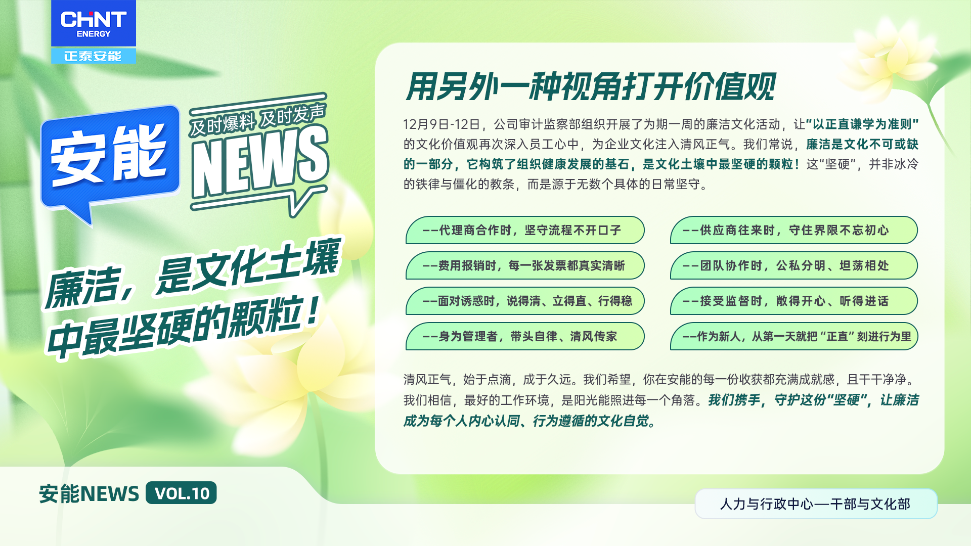 清风正气,始于点滴,成于久远。我们希望,你在安能的每一份收获都充满成就感,且干干净净。我们相信,最好的工作环境,是阳光能照进每一个角落。我们携手,守护这份“坚硬”,让廉洁成为每个人内心认同、行为遵循的文化自觉。💪🌞