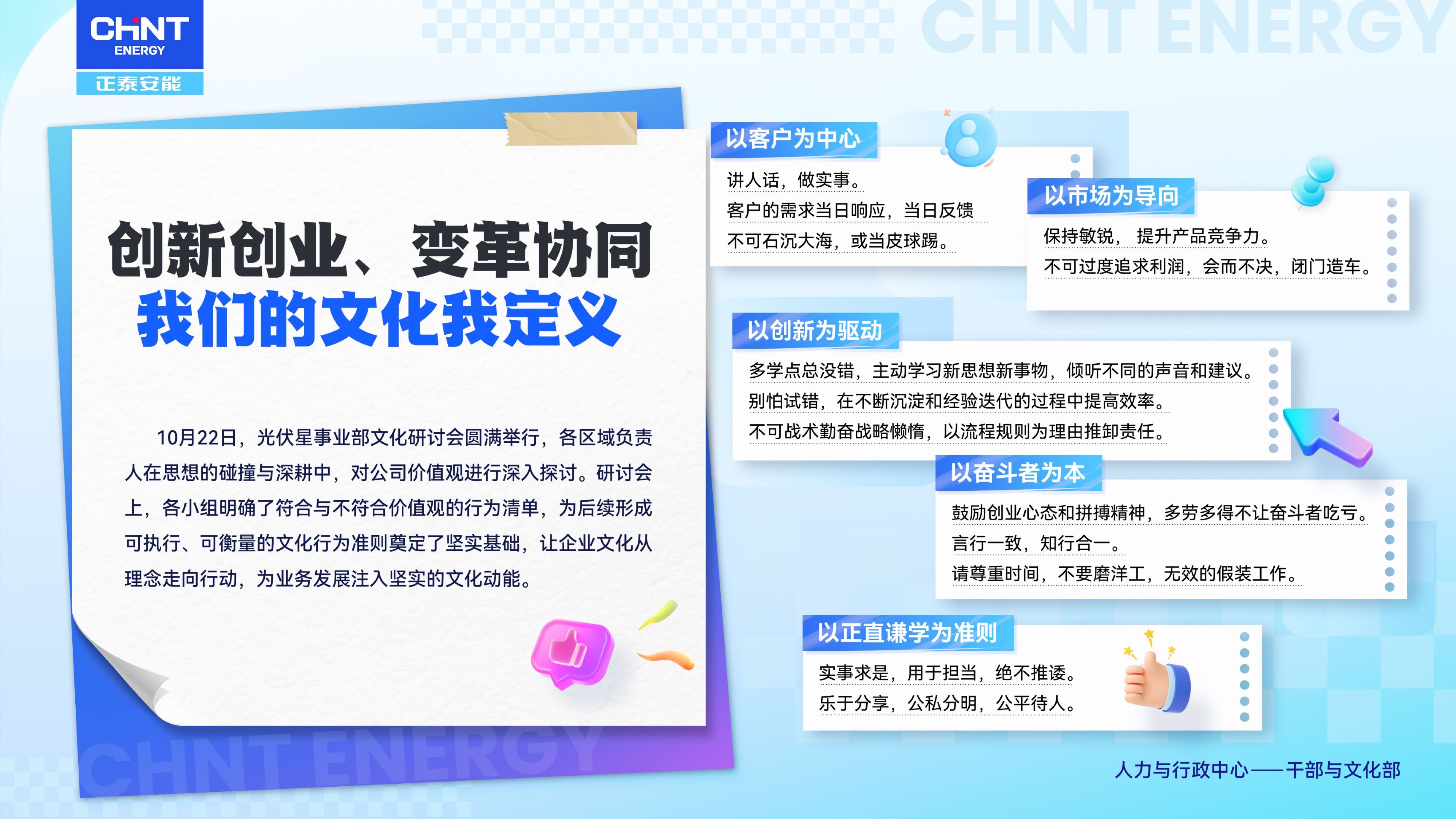 10月底,企业文化协同光伏星事业部进行了一场文化价值观研讨交流。来自十大区域公司区总及各二级模块负责人汇聚杭州,真实分享,在思想的碰撞与深耕中,共识价值观的行为清单,进行了一次对未来行动校准方向的启航,为后续形成可执行、可衡量的行为准则奠定了坚实基础。创新创业,变革协同,我们的文化我定义。